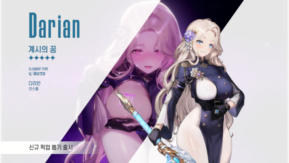 10월 2일 업데이트로 추가된 물속성 딜러 다리안입니다. 초기 코스튬은 계시의 꿈입니다. 통상 캐릭터로 명함 및 1성 가성비를 권장합니다. 1성기준 sp3개 소모 500%의 물리 피해를 줍니다 메인 타겟은 추가로 775%의 물리 피해를 주는 특징이 있습니다. 성능은 둘째치고 컷씬이 엄청났던 캐릭터..